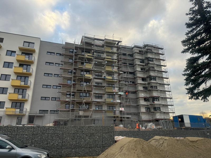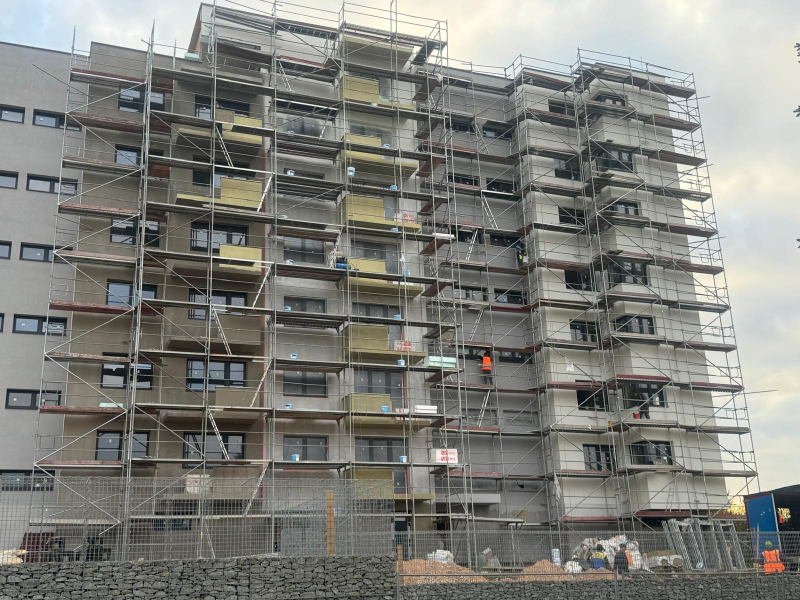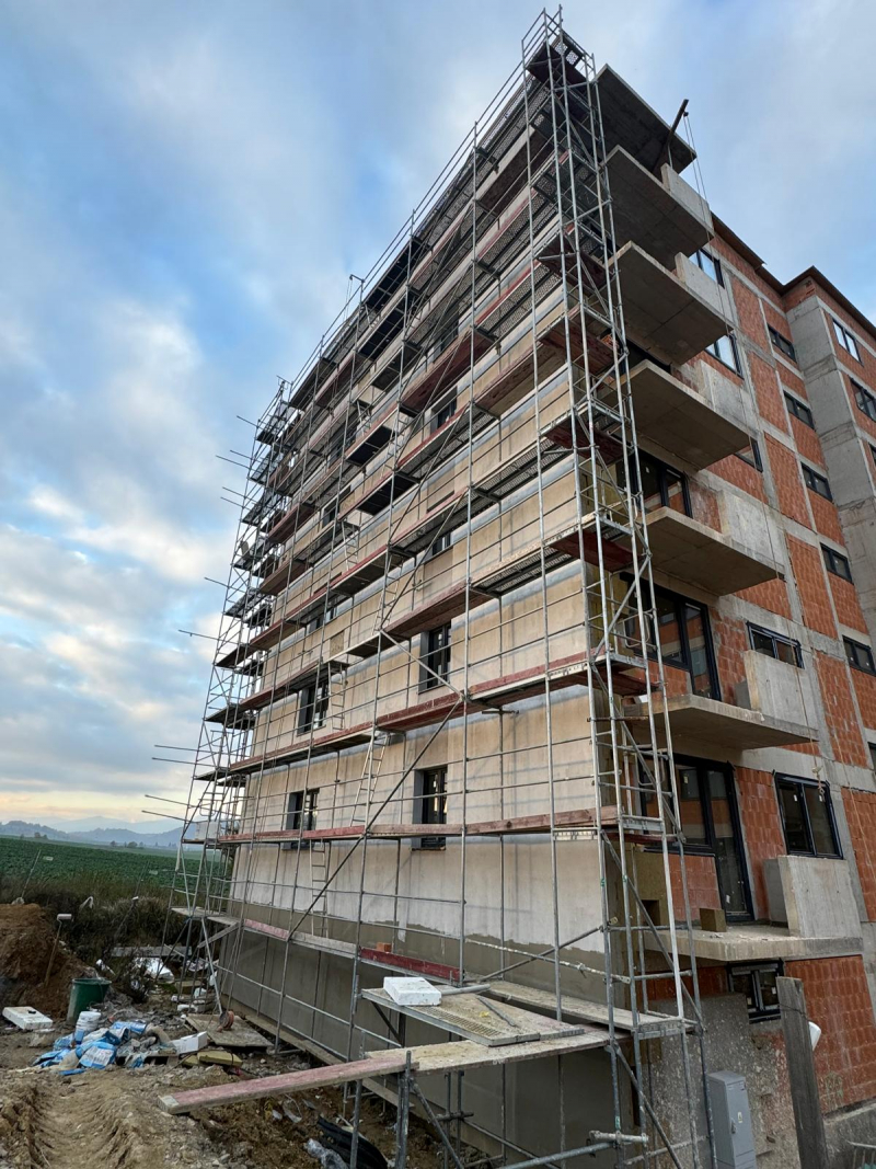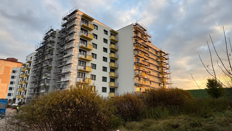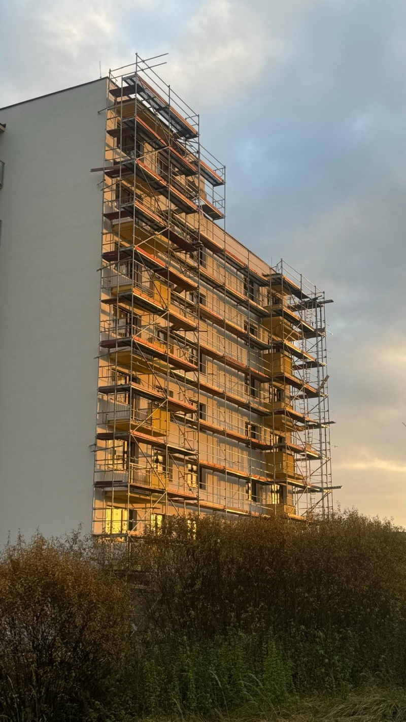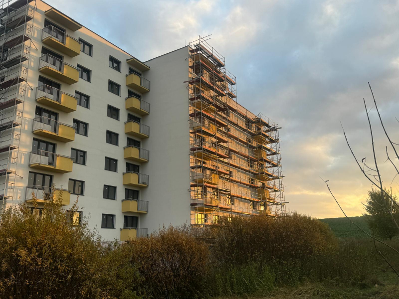 Realizácia lešenia na novostavbe bytového domu v časti MAZORNÍK, Brezno - Zabezpečili sme montáž fasádneho lešenia prispôsobeného členitému pôdorysu objektu. Lešenie slúžilo na realizáciu vonkajších stavebných prác a zateplenia.
